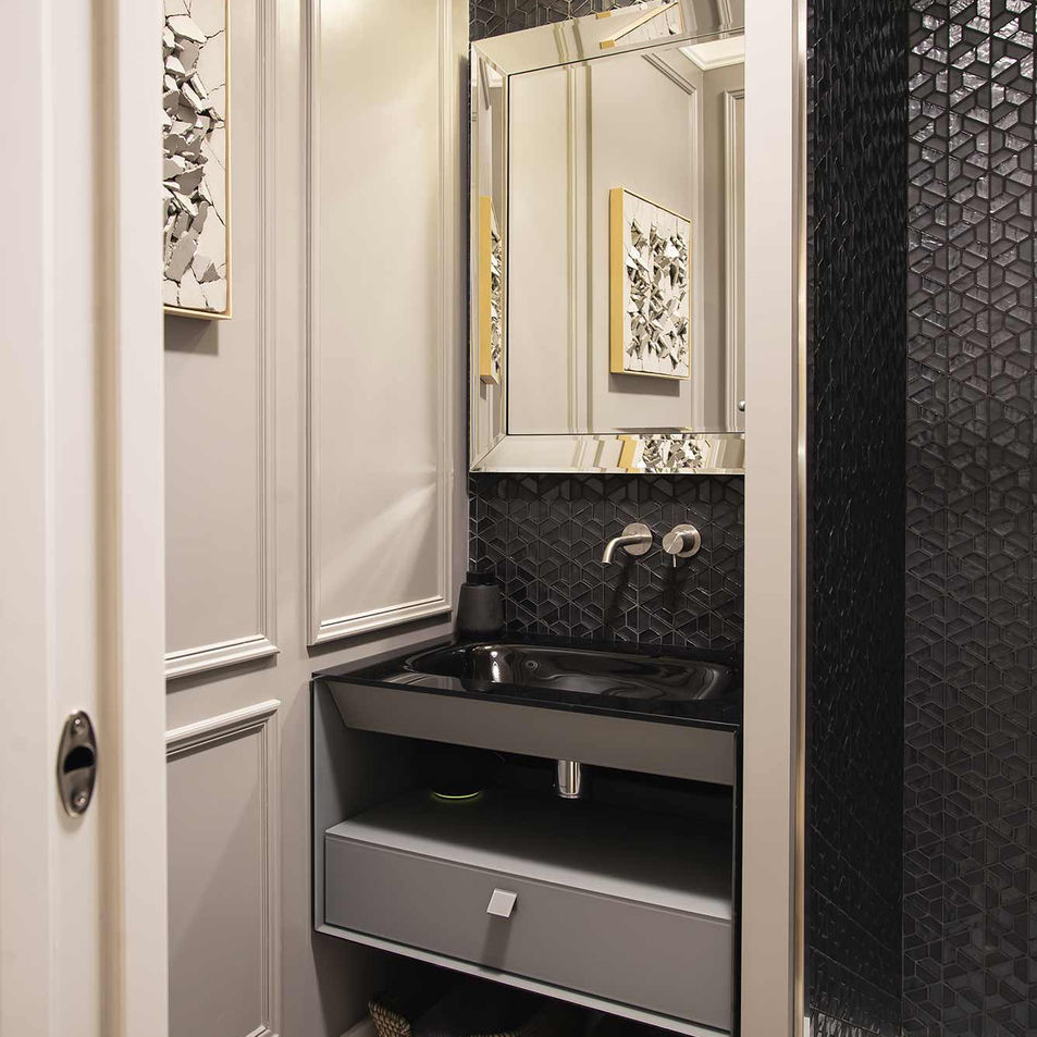 Il bagno degli ospiti, accessibile dalla sala attraverso un antibagno, è un piccolo gioiello di design. Le finiture richiamano i vetri e metalli preziosi della zona giorno, mentre la carta da parati, con il suo decoro leggero, avvolge l’ambiente e si riflette nello specchio a tutta parete, creando un effetto sorprendente e raffinato. Ogni elemento è stato pensato per stupire, rendendo questo bagno un luogo di eleganza e fascino.