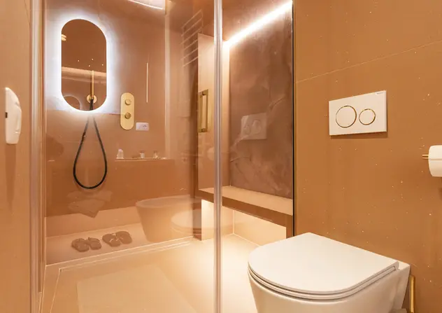 Nei bagni delle suite sono stati utilizzati i pannelli ULTRALIGHT di Tecnografica, scelti per la loro leggerezza strutturale e l’estetica contemporanea.